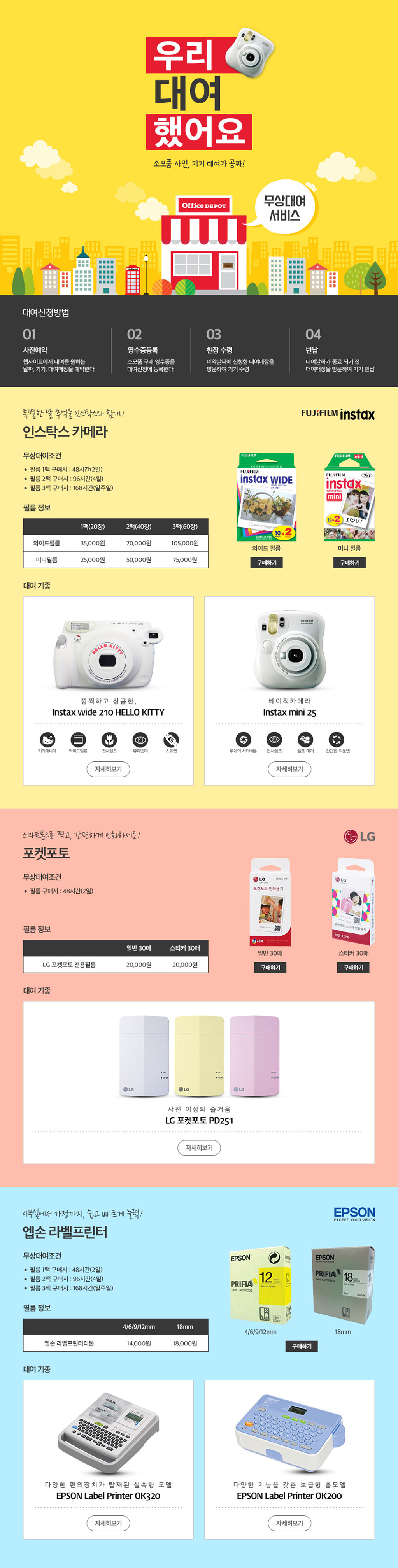와이드필름 - 구매하기 미니필름 - 구매하기 인스타 와이드 210 헬로키티 - 자세히보기 인스탁스 미니 25 - 자세히보기 일반 30매 - 구매하기 스티커 30매 - 구매하기 LG 포켓포토 PD251 - 자세히보기 4/6/9/12/18mm - 구매하기 엡손 라벨 프린터 OK320 - 자세히보기 엡손 라벨 프린터 OK200 - 자세히보기